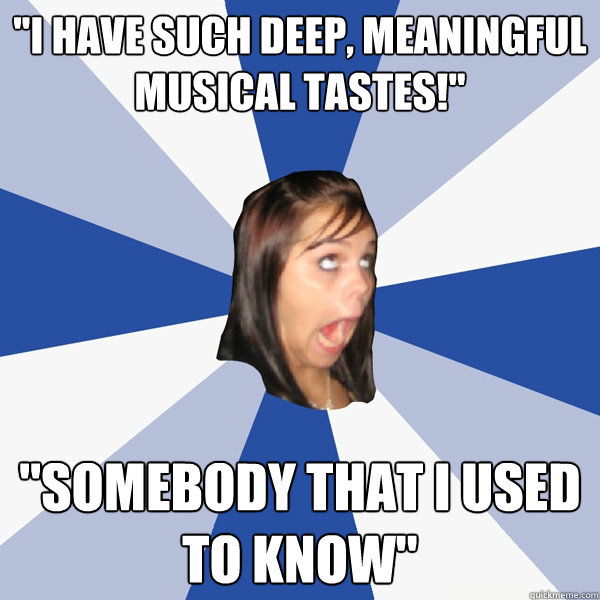 "i have such deep, meaningful musical tastes!" "somebody that i used to know"