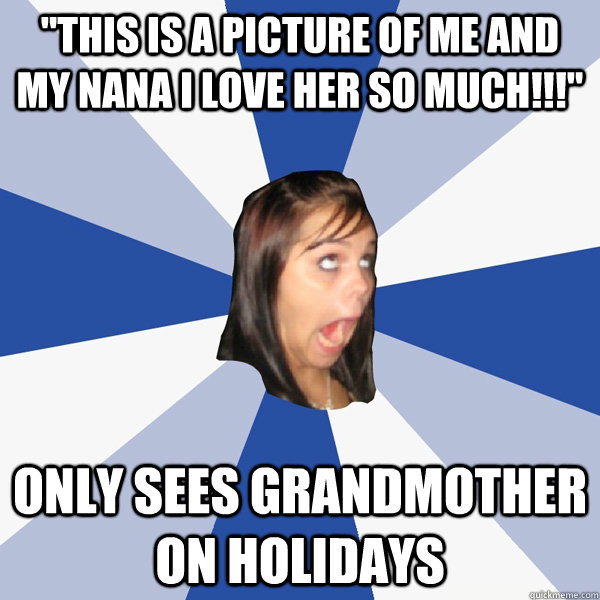 "This is a picture of me and my nana i love her so much!!!" Only sees grandmother on holidays