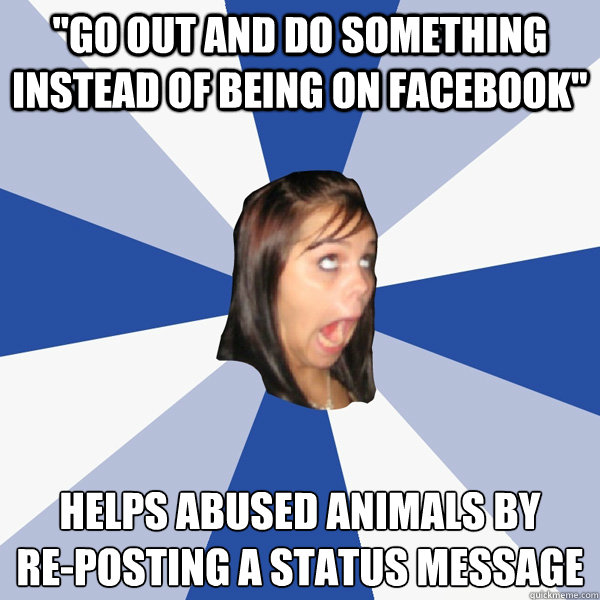 "Go out and do something instead of being on Facebook" Helps abused animals by re-posting a status message