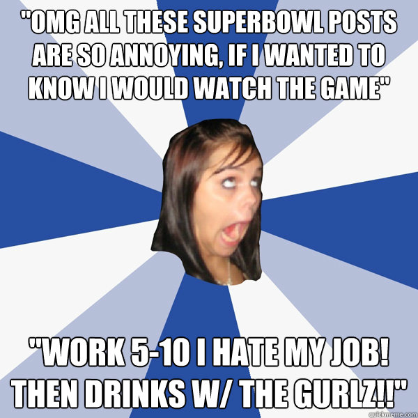 "Omg all these SuperBowl posts are so annoying, if I wanted to know I would watch the game" "work 5-10 I hate my job! Then drinks w/ the gurlz!!"