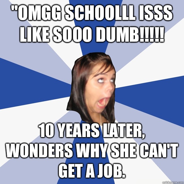 "OMGG schoolll isss like sooo dumb!!!!! 10 Years later, wonders why she can't get a job.