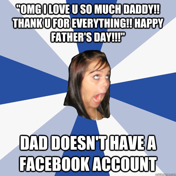 "omg I LOVE U SO MUCH DADDY!! THANK U FOR EVERYTHING!! HAPPY father's day!!!" dAD Doesn't have a facebook account