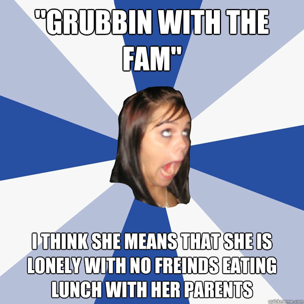 "grubbin with the fam" i think she means that she is lonely with no freinds eating lunch with her parents