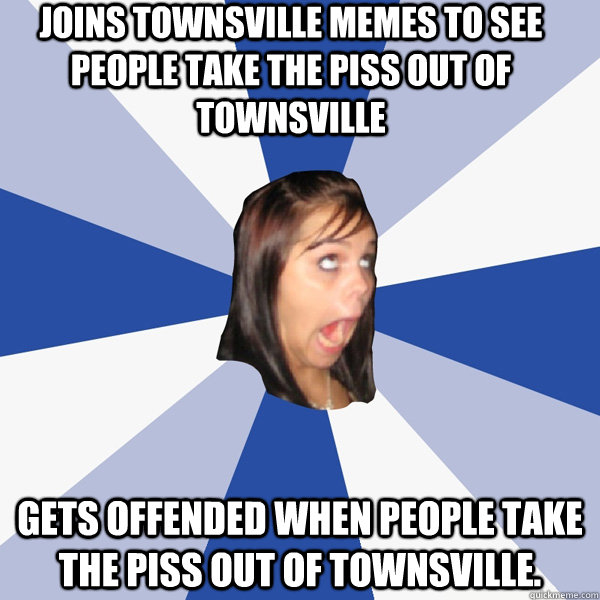 JOINS TOWNSVILLE MEMES TO SEE PEOPLE TAKE THE PISS OUT OF TOWNSVILLE GETS OFFENDED WHEN PEOPLE TAKE THE PISS OUT OF TOWNSVILLE.