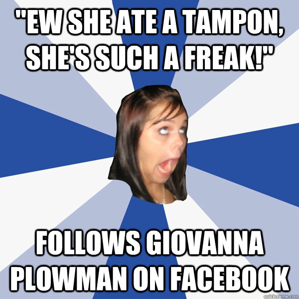 "EW SHE ATE A TAMPON, SHE'S SUCH A FREAK!" Follows GIOVANNA PLOWMAN ON FACEBOOK