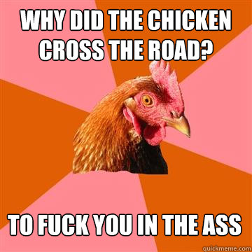 WHy did the chicken cross the road? to fuck you in the ass