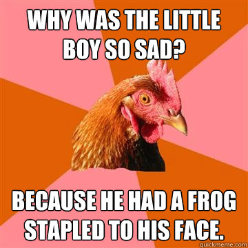 Why was the little boy so sad? Because he had a frog stapled to his face.