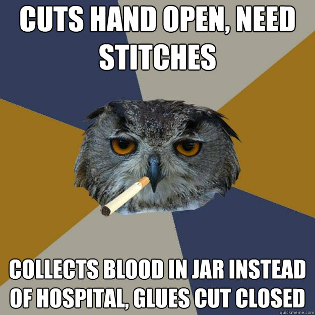 Cuts hand open, need stitches collects blood in jar instead of hospital, glues cut closed