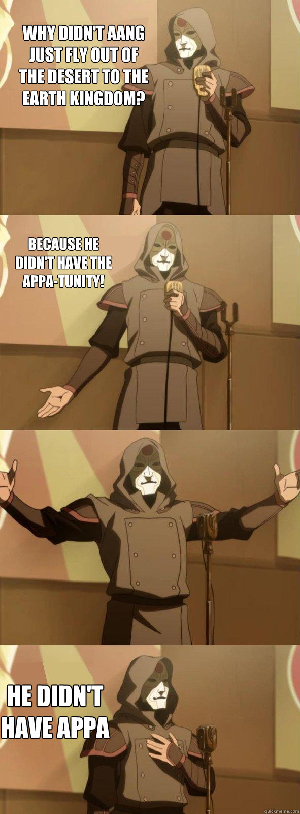 Why didn't aang just fly out of the desert to the earth kingdom? he didn't have appa Because he didn't have the appa-tunity!