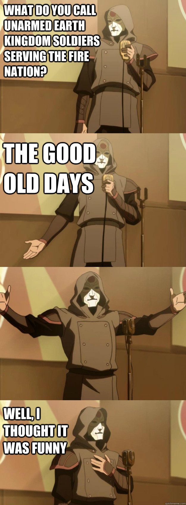 What do you call unarmed earth kingdom soldiers serving the fire nation? the good old days Well, I thought it was funny