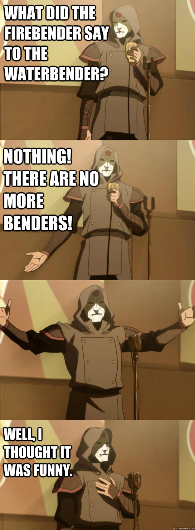What did the firebender say to the waterbender? Nothing! There are no more benders! Well, I thought it was funny.