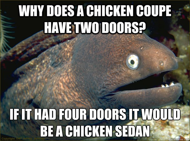 Why does a chicken coupe have two doors? If it had four doors it would be a chicken sedan