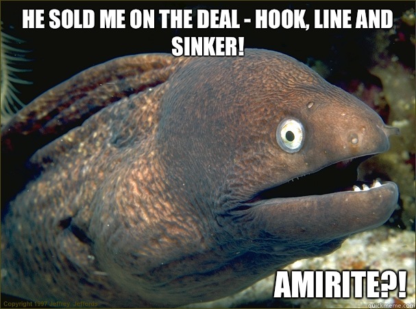 He sold me on the deal - hook, line and sinker! AMIRITE?!