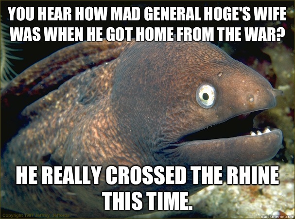 You hear how mad General Hoge's wife was when he got home from the war? He really crossed the Rhine this time.