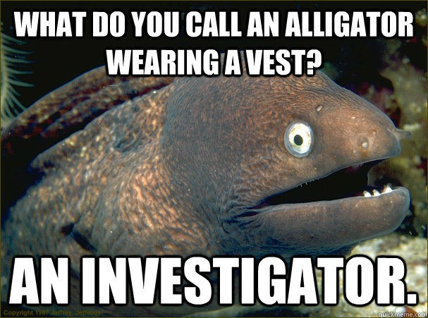 what do you call an alligator wearing a vest? an investigator.