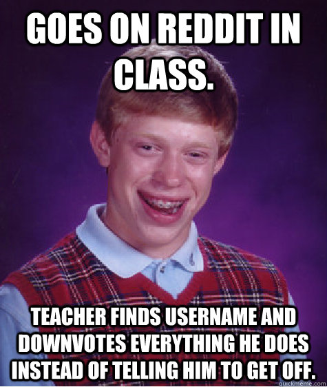 Goes on reddit in class. Teacher finds username and downvotes everything he does instead of telling him to get off.