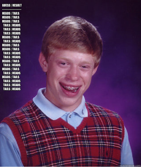 Guess | result -------------------- heads | tails heads | tails heads | tails tails | heads tails | heads tails | heads heads | tails tails | heads heads | tails heads | tails tails | heads tails | heads heads | tails tails | heads heads | t