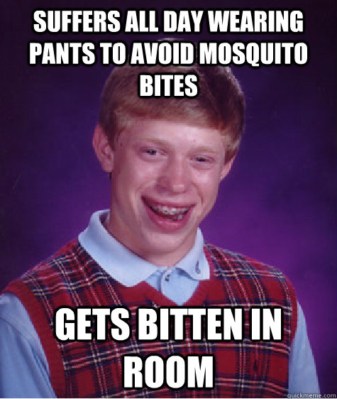 Suffers all day wearing pants to avoid mosquito bites Gets bitten in room