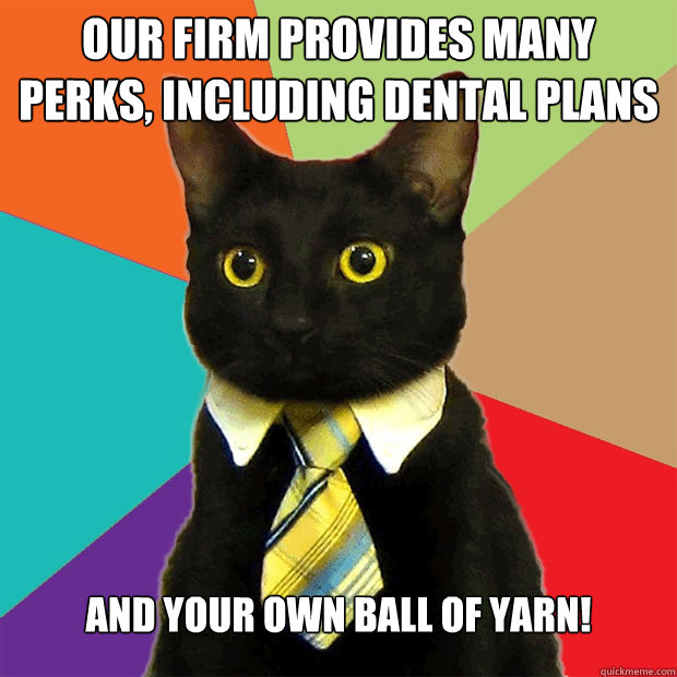Our firm provides many perks, including dental plans And your own ball of yarn!
