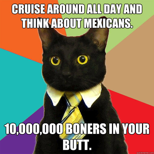 Cruise around all day and think about Mexicans. 10,000,000 boners in your butt.