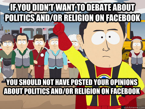 If you didn't want to debate about politics and/or religion on Facebook You should not have posted your opinions about politics and/or religion on facebook