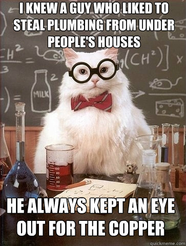 i knew a guy who liked to steal plumbing from under people's houses he always kept an eye out for the copper