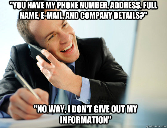 "You have my phone number, address, full name, e-mail, and company details?" "No way, I don't give out my information"