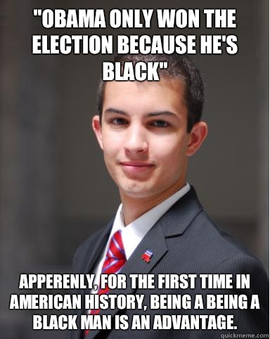 "Obama only won the election because he's black" Apperenly, for the first time in American history, being a being a black man is an advantage.