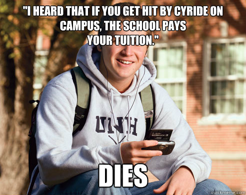 "I heard that if you get hit by CyRide on campus, the school pays your tuition." Dies
