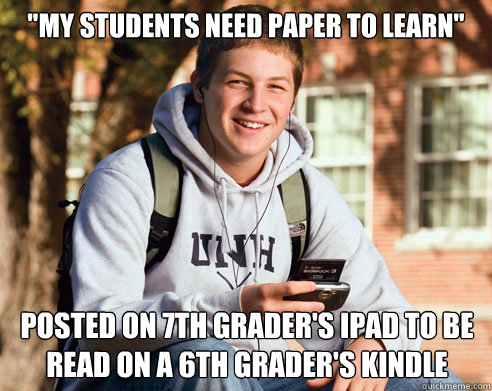 "My students need paper to learn" Posted on 7th grader's ipad to be read on a 6th grader's kindle