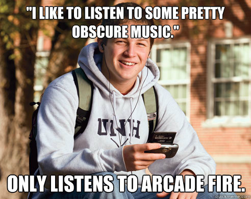"I like to listen to some pretty obscure music." Only listens to Arcade Fire.