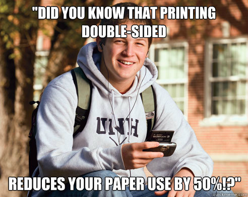 "Did you know that printing double-sided reduces your paper use by 50%!?"