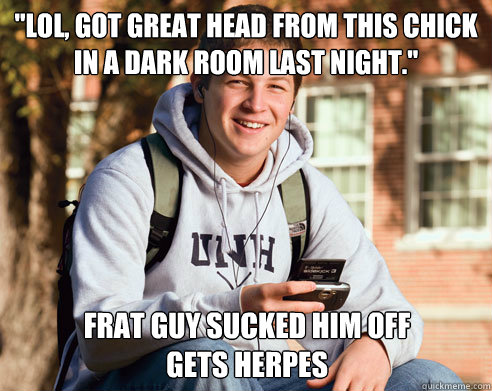"Lol, got great head from this chick in a dark room last night." frat guy sucked him off Gets herpes