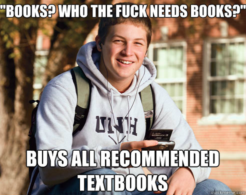 "BookS? Who the fuck needs books?" buys all recommended textbooks