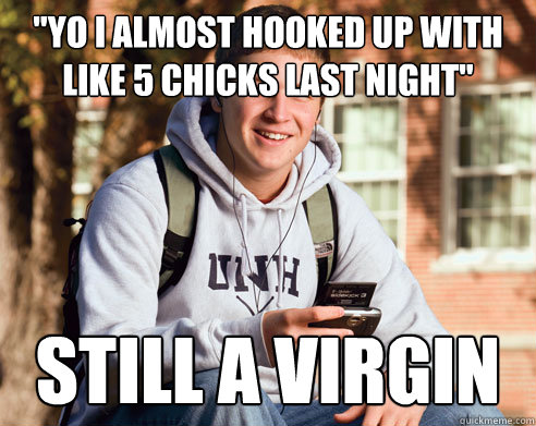 "yo I almost hooked up with like 5 chicks last night" still a virgin