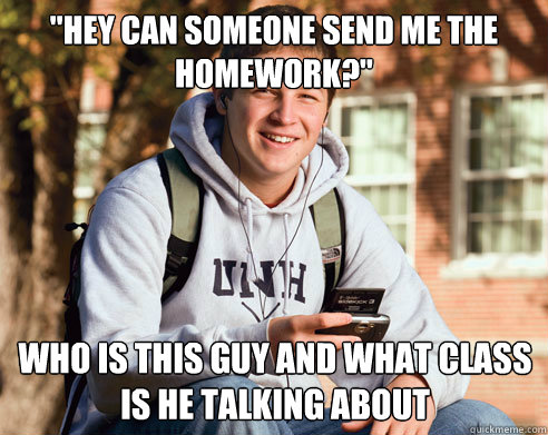"Hey can someone send me the homework?" Who is this guy and what class is he talking about