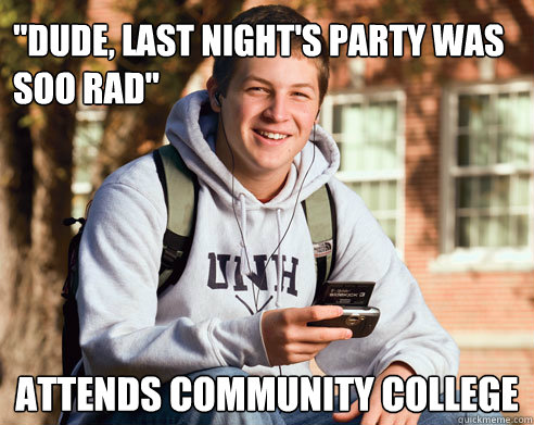 "Dude, last night's party was soo rad" Attends community college