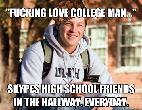 "Fucking love college man..." Skypes high school friends in the hallway. Everyday.