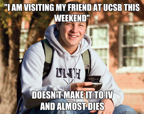 "I am visiting my friend at UCSB this weekend" Doesn't make it to IV and almost dies