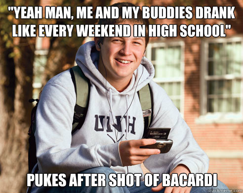 "yeah man, me and my buddies drank like every weekend in high school" pukes after shot of bacardi