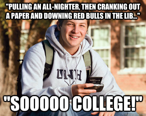 "Pulling an all-nighter, then cranking out a paper and downing red bulls in the lib..." "Sooooo college!"
