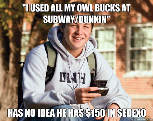 "I used all my owl bucks at Subway/Dunkin" has no idea he has $150 in sedexo