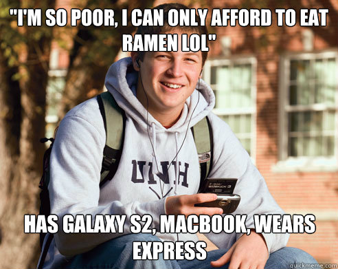 "i'm so poor, i can only afford to eat ramen lol" has galaxy s2, macbook, wears express