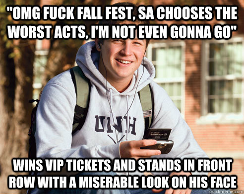 "OMG fuck fall fest, SA chooses the worst acts, i'm not even gonna go" Wins VIP tickets and stands in front row with a miserable look on his face