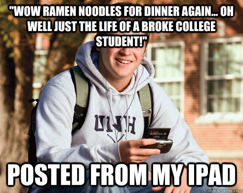 "wow ramen noodles for dinner again... oh well just the life of a broke college student!" posted from my ipad