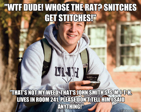 "wtf dude! whose the rat? Snitches get stitches!" "that's not my weed, that's john smith's. s-m-i-t-h. lives in room 241. please don't tell him i said anything!"