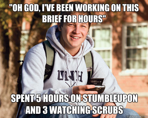 "oh god, i've been working on this brief for hours" spent 5 hours on stumbleupon and 3 watching scrubs
