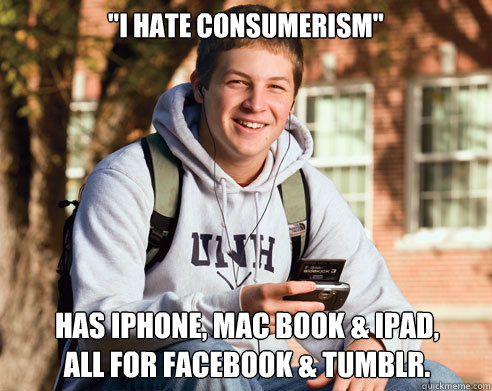 "i hate consumerism" has iphone, Mac book & ipad, all for facebook & tumblr.