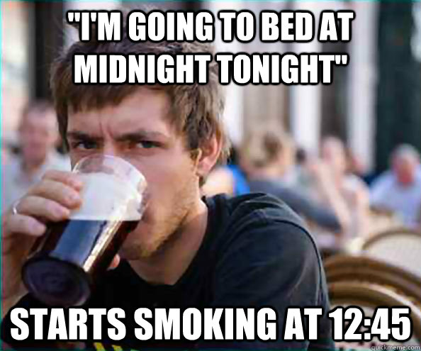 "I'm going to bed at midnight tonight" Starts smoking at 12:45