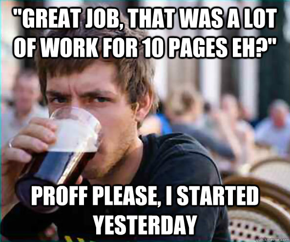 "Great job, that was a lot of work for 10 pages eh?" Proff Please, I started yesterday